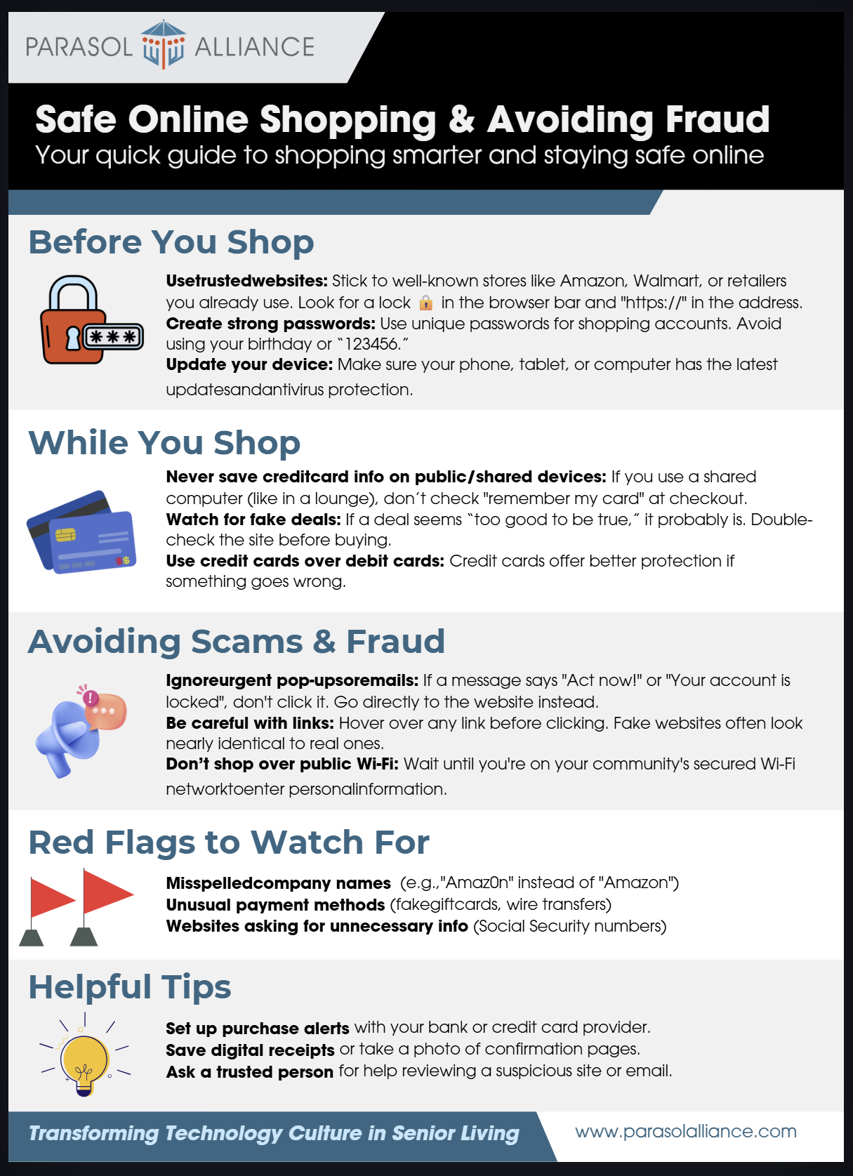 Safe Online Shopping & Avoiding Fraud Infographic Feb 18 Written By Parasol Alliance Your quick guide to shopping smarter and staying safe online Click here to download this graphic. Download this graphic Parasol Alliance